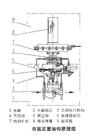 供氮裝置結(jié)構(gòu)如右圖所示,將設(shè)在罐頂?shù)娜狐c的介質(zhì)經(jīng)導(dǎo)壓管引入檢測機構(gòu)(7)、介質(zhì)在檢測元件上產(chǎn)生一個作用力與彈簧(8)、預(yù)緊力相平衡。當(dāng)罐內(nèi)壓力降低到低于供氮裝置壓力設(shè)定點時,平衡被破壞,使指揮器閥芯(6)打開,從而使閥前氣體經(jīng)減壓閥(5)、節(jié)流閥(4)、進入主閥執(zhí)行機構(gòu)(3)上、下膜室,打主開閥閥芯(2)、向罐內(nèi)充注氮氣;當(dāng)罐內(nèi)壓力升到供氮裝置壓力設(shè)定點時,由于預(yù)設(shè)彈簧力,關(guān)閉指揮器閥芯(6)又由于主閥執(zhí)行機構(gòu)中彈簧作用,關(guān)閉主閥,停止供氮。